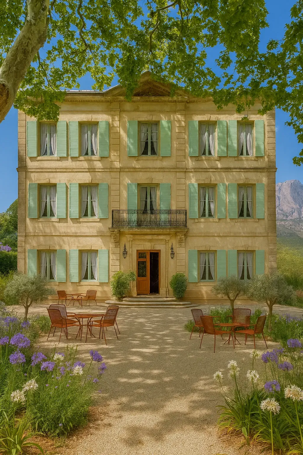 Autour des bastides d’Aix-en-Provence et du pays aixois, elle révèle la noblesse simple des tracés provençaux : perspectives maîtrisées, oliveraies structurantes, lavandes, cyprès élancés, travertins lumineux.